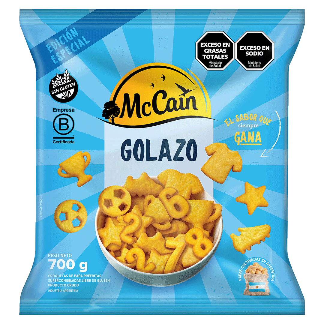 Papa, aceite vegetal de girasol, cobertura (almidón modificado, harina de arroz, dextrina, fibra de arveja, proteína de arveja, leudantes químicos (INS 450i, INS500ii), espesante (INS 415)), dextrosa, estabilizante (INS 450i).